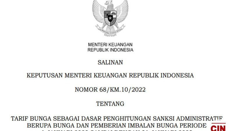 Penetapan tarif bunga per bulan tersebut diatur dalam Keputusan Menteri Keuangan No.68/KM.10/2022. Beleid ini diteken Kepala Badan Kebijakan Fiskal (BKF) Febrio Nathan Kacaribu atas nama Menteri Keuangan pada 27 Desember 2022.