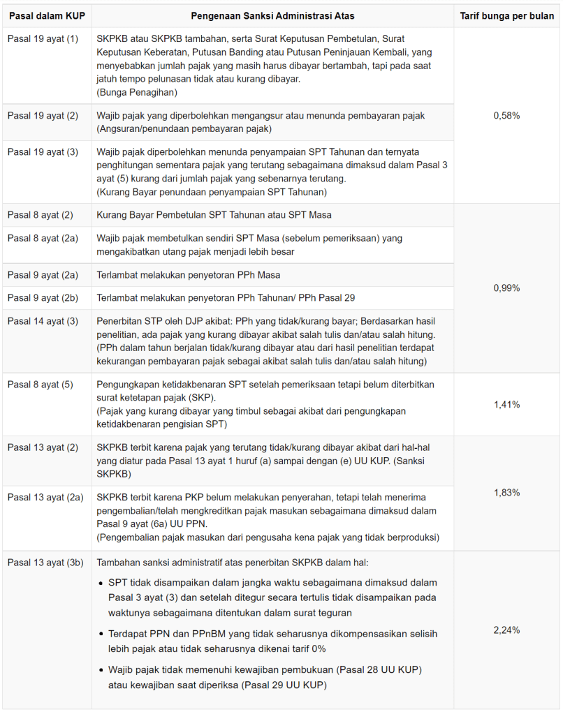 Terdapat 5 tarif bunga per bulan untuk sanksi administrasi, yaitu mulai dari 0,58% sampai dengan 2,24%. Kelima tarif tersebut lebih rendah dibandingkan dengan tarif pada periode Desember 2022. Simak ‘Tarif Bunga Sanksi Administrasi Pajak Desember 2022, Cek di Sini’.