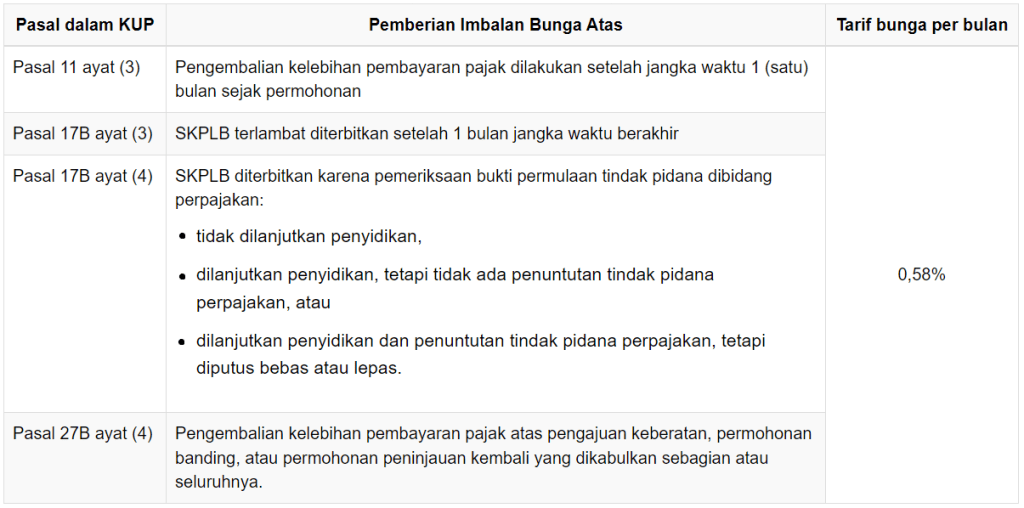 Sementara itu, tarif bunga per bulan sebagai dasar pemberian imbalan bunga ditetapkan 0,58%, atau lebih rendah ketimbang tarif periode sebelumnya. Perincian tarif per bulan atas imbalan bunga pajak periode 1 Januari-31 Januari 2023 dapat dilihat pada tabel berikut.