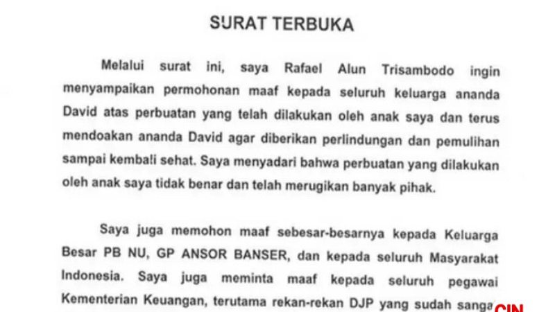 “Bersama ini, saya Rafael Alun Trisambodo menyatakan pengunduran diri atas jabatan dan status saya sebagai Aparatur Sipil Negara Direktorat Jenderal Pajak mulai Jumat 24 Februari 2023,” dalam surat pengunduran diri Rafael yang dikutip, Sabtu (25/2/2023).