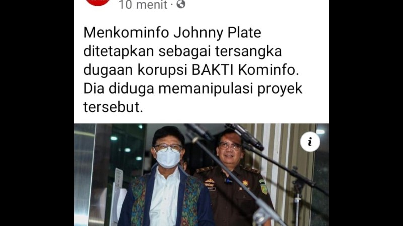 JAKARTA – Beredar sebuah unggahan artikel berita dari CNN Indonesia yang dibagikan kembali pada media sosial Facebook milik CNN Indonesia pada Rabu (15/3/2023) tentang status hukum Menteri Komunikasi dan Informatika (Menkominfo) Johnny G. Plate dalam kasus korupsi BAKTI Kominfo.