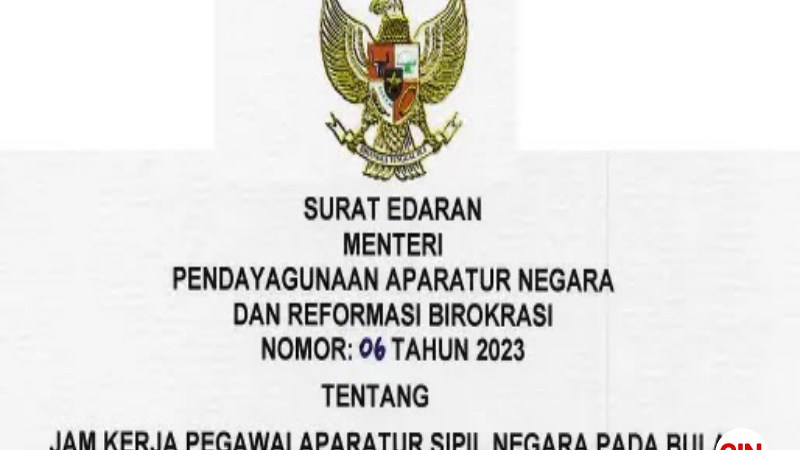 Hal ini tertuang dalam Surat Edaran (SE) Menteri PANRB No. 6/2023 tentang Jam Kerja Pegawai Aparatur Sipil Negara pada Bulan Ramadhan 1444 Hijriah di Lingkungan Pemerintah.