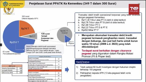 “Kamis tanggal 9 Maret 2023, PPATK baru mengirim surat nomornya SR/2748/AT.01.01/III/2023 surat itu tertanggal 7 Maret tapi baru kami terima by hand tanggal 9, namun surat ini berisi 36 halaman lampiran mengenai surat-surat PPATK ke Inspektorat Jenderal Kementerian Keuangan periode 2009-2023, 196 surat di dalam 36 halaman lampiran. Di situ tidak ada data mengenai nilai uang. Jadi hanya surat ini kami pernah kirim tanggal sekian nomor sekian dengan nama orang-orang yang tercantum di dalam surat tersebut atau yang disebutkan diselidiki oleh PPATK atau yang dicantumkan PPATK,” imbuh Sri Mulyani.