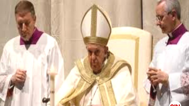 Pada awal misa, Paus Fransiskus tampak tiba dengan kursi roda yang ia gunakan untuk mengatasi nyeri lutut.