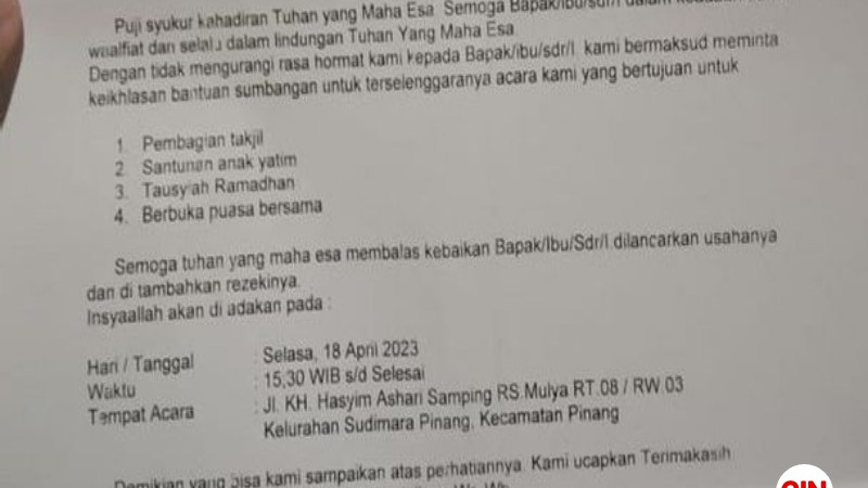 Isi surat itu bersifat meminta sumbangan untuk menggelar acara atau kegiataan buka puasa bersama hingga pembagian takjil.