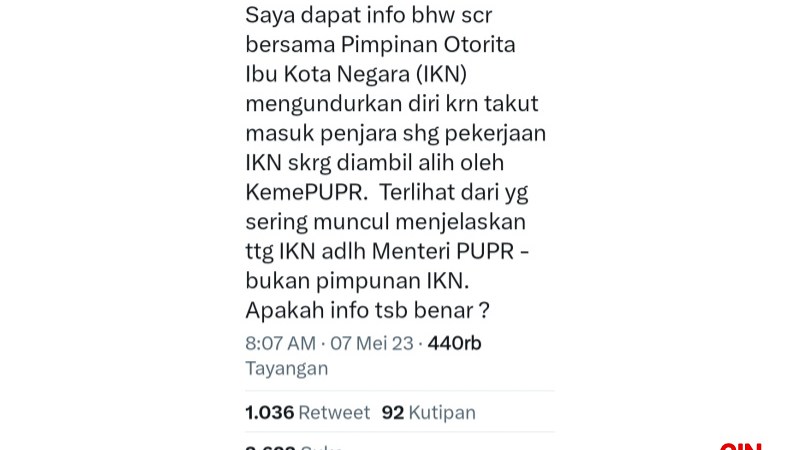 Kabar hengkangnya para petinggi IKN itu pertama kali disampaikan oleh eks Sekretaris Badan Usaha Milik Negar (BUMN) Said Didu melalui cuitan di akun twitternya pada, Minggu (7/5/2023).
