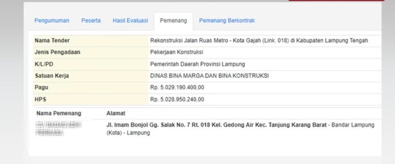 “Dalam LPSE Provinsi Lampung, sebuah CV memenangkan Rekonstruksi Jalan Ruas Kota Gajah ke Metro untuk Tahun 2022, dengan pagu Rp5 miliar. Dalam maklumat tersebut, tender dianggap sudah selesai alias bukan batal,” demikian narasi yang disampaikan Lampung TV.