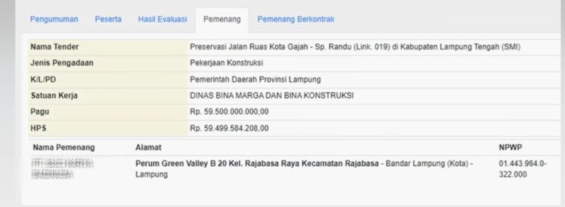 Selain kedua perusahaan tersebut, ada lagi sebuah perseroan terbatas yang tercatat dalam LPSE Provinsi Lampung sebagai pemenang proyek jalan ruas Kotagajah ke Simpang Randu, dengan pagu 59 miliar rupiah untuk Tahun 2022.