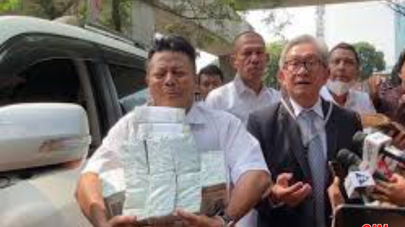 JAKARTA – Maqdir Ismail Pengacara terdakwa kasus BTS Kominfo Irwan Hermawan membawa uang yang konon bernilai US$ 1,8 juta atau setara Rp 27 miliar ke Kejaksaan Agung (Kejagung), Kamis (13/7/2023).
