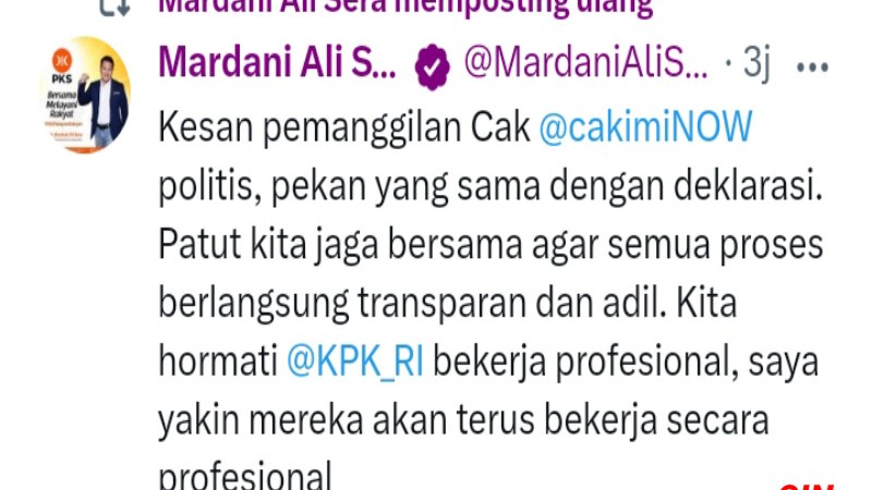 “Kesan pemanggilan Cak @cakimiNOW politis, pekan yang sama dengan deklarasi,” kata Mardani dalam akun X-nya, @MardaniAliSera, Selasa (5/9/2023).