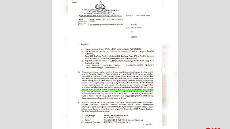‘Sehubungan dengan rujukan tersebut di atas, kami informasikan kepada Saudara bahwa saat ini Penyidik Direktorat Reserse Kriminal Umum Polda Kepri sedang melakukan penyelidikan terhadap perkara dugaan tindak pidana dengan sengaja menghancurkan atau merusak gedung/ bangunan yang menimbulkan bahaya umum bagi barang dan nyawa orang lain dan/ atau paksaan dan perlawanan terhadap pejabata yang sedang melaksanakan tugas yang sah yang mengakibatkan luka-luka/ luka berat dan/ atau barang siapa dengan terang-terangan dan dengan tenaga bersama menggunakan kekerasan terhadap orang atau barang yang mengakibatkan luka-luka/ luka berat Junto mereka yang sengaja memberi bantuan pada waktu kejahatan dilakukan atau mereka yang sengaja memberi sarana untuk melakukan kejahatan, sebagaimana dimaksud dalam Pasal 200 KUHP dan/ atau Pasal 214 KUHP Jo Pasal 212 KUHP dan/ atau PAsal 170 KUHP Jo Pasal 56 KUHP, yang terjadi pada hari Senin tanggal 11 September 2023 di Kota Batam sebagaimana Laporan Informasi tersebut di atas.’