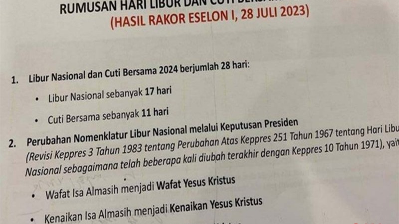 Nomenklatur terbaru itu termaktub bersama 16 rangkaian hari libur, antara lain 1 Januari Tahun Baru Masehi, 1 Muharam Tahun Baru Islam Hijriah, Isra Mi’raj Nabi Muhammad SAW, Idul Fitri (dua hari), Idul Adha, Maulid Nabi Muhammad SAW, Hari Suci Nyepi (Tahun Baru Saka), Hari Raya Waisak, Proklamasi Kemerdekaan 17 Agustus, Hari Lahir Pancasila 1 Juni, dan Hari Buruh Internasional 1 Mei.