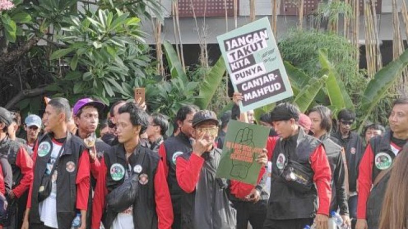 “Assalamu’alaikum, Walaikumsalam, Assalamu’alaikum, Walaikumsalam, Ganjar-Mahfud datang bawa pasukan, ” begitu bunyi sorak sorai pendukung dari nomor 03.