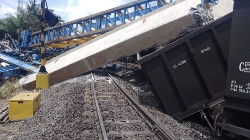 PALEMBANG – PT Kereta Api Indonesia (KAI) Divre III Palembang sedang mengevakuasi rangkaian kereta pengangkut batu bara yang tertimpa besi proyek pembangunan jalan layang di perlintasan Bantaian Petak Jalan Gunung Megang- Penanggiran Kabupaten Muara Enim, Sumatera Selatan, Kamis, sekitar pukul 11.00 WIB.