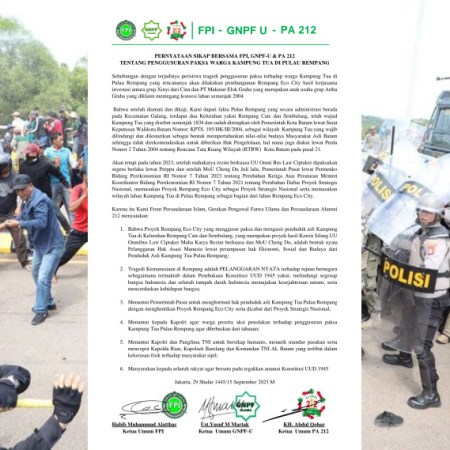 Enam Pernyataan Sikap FPI GNPF-U dan PA 212 Terkait Penggusuran Paksa Warga Kampung Tua di Pulau Rempang